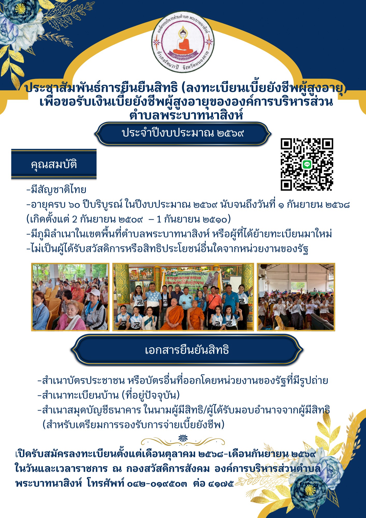 ประชาสัมพันธ์การยืนยันสิทธิ(ลงทะเบียนเบี้ยยังชีพผู้สูงอายุ) เพื่อขอรับเงินเบี้ยยังชีพผู้สูงอายุขององค์การบริหารส่วนตำบลพระบาทนาสิงห์ ประจำปีงบประมาณ 2569